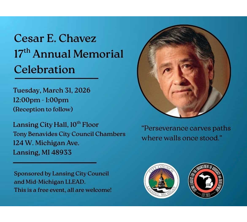The City of Lansing will recognize Cesar E. Chavez with the 17th Annual Memorial Celebration. March 31st, which would have been his 99th birthday, a brief ceremony from 12:00pm to 1:00pm with a reception to follow. The Tony Benavides City Council Chambers which is located on the 10th Floor of City Hall at 124 W. Michigan Ave. Sponsored by the Lansing City Council and LLEAD of Greater Lansing. A reception will follow. The celebration is open to the public.