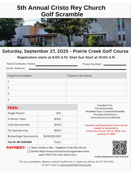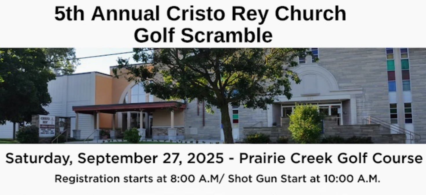 Cristo Rey Church is still seeking golfers and sponsors for the 5th Annual Golf Scramble to be held at the Prairie Creek Golf Course in DeWitt Saturday, September 27th. Registration starts at 8:00am with a Shot Gun start at 10:00am.